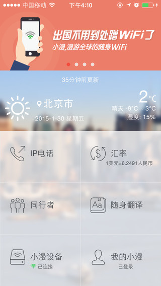 而朱志金表示,小漫WiFi只是一个开始,为了实现“在其他国家也能和在自己国家一样方便”的目标,小漫Wifi的app集成了「天气」、「汇率」、「翻译」、「国际电话」功能,基本出境旅行需要的工具式服务都被囊括其中,未来还将发力旅行社交、旅游购物、当地服务等功能。陪你在路上走的更远。