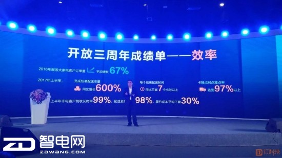 效率方面,2016年服务大家电客户订单量平均增长67%;2017年上半年完成包裹配送总量同比增长600%,每个包裹配送时间同比节省7个小时以上;卡班点对点准点率达到97%以上,沸点客户揽收及时率99%,配送及时率98%,履约成本下降30%。