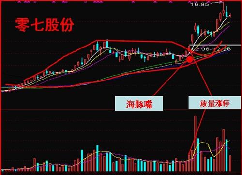 海豚嘴形态:股价沿上升通道运行,日K线均线(5日、20日、40日)同步缓慢上升一段时间后,开始走平,直至三均线靠得很近或几乎交叉于一点。此时,三均线从上升初期至此所形成的均线图形,酷似一只从大海跃起的海豚。