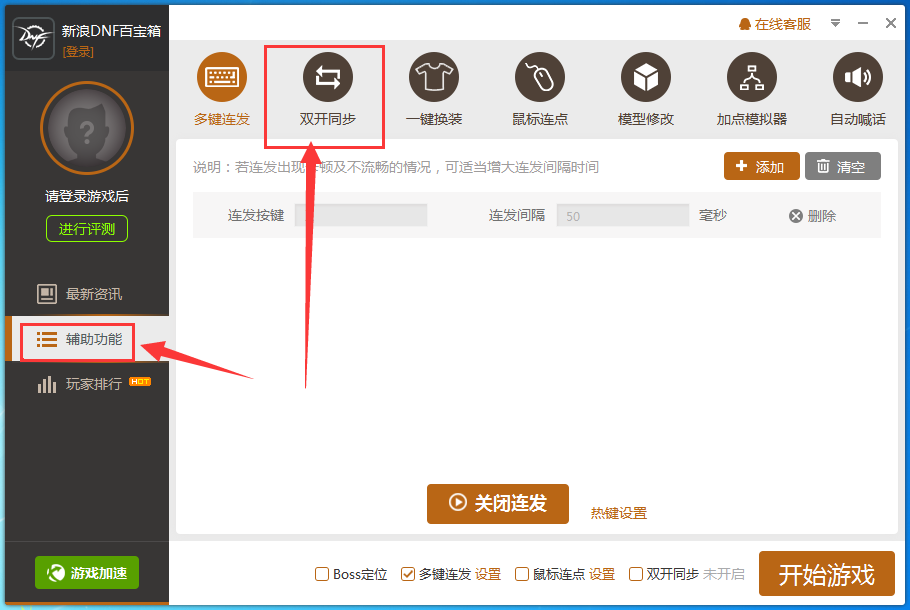 2、打开“DNF百宝箱”后我们在该界面的左侧点击“辅助功能”,接着在“辅助功能”界面即可看到“双开同步”的功能;