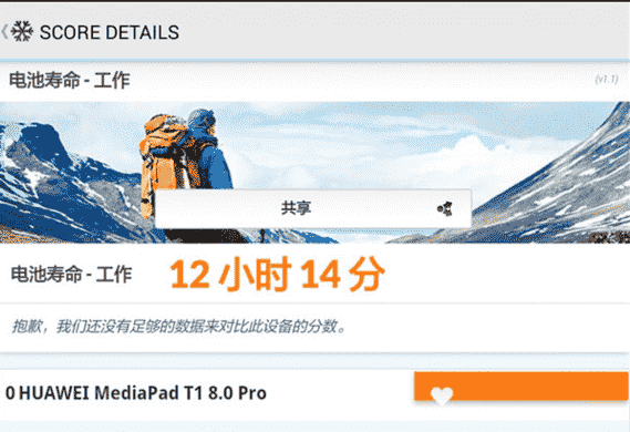 对于一款平板电脑来说续航是一个值得关注的问题,原因在于它要支持的显示屏的尺寸相对要大一些,耗电自然会增加。配备的是一款8英寸1280×800分辨率的高清显示屏,其耗电量可想而知。笔者在拿到这款产品后最先测试的就是续航能力。在充满电的情况下使用《PCMark For Android》进行测试,结果令人吃惊,居然达到了12小时14分钟。