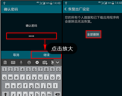 输入屏幕锁的密码后,点击【继续】,然后在点击【全部删除】即可。